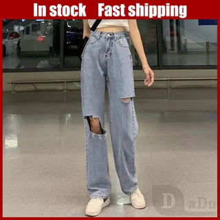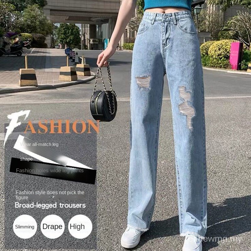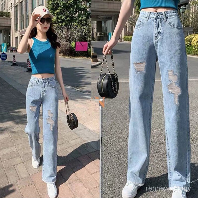 Baggy Jeans Koyak Perempuan Straight Cut Jeans Women Ripped Jeans High Waist Wide Legs All Match Korean Style Shopee Malaysia