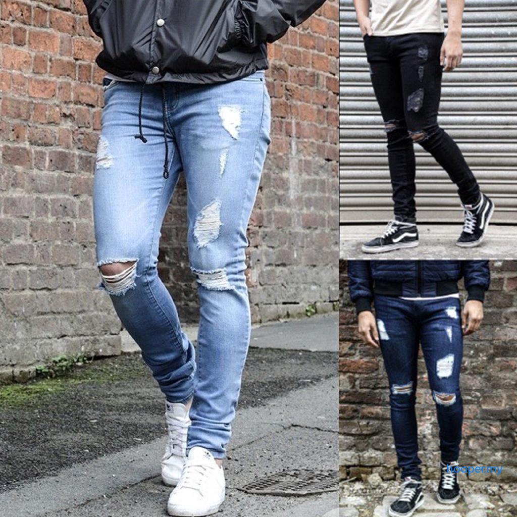 Mens Skinny Stretch Denim Long Pants Distressed Ripped Slim Fit Jeans Trousers Shopee Malaysia